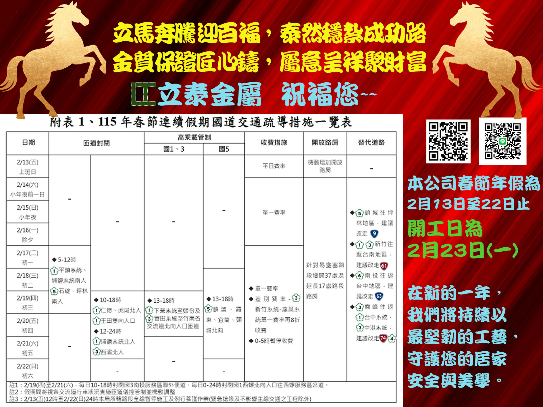 115年度立泰金屬 祝賀大家~~馬年到,馬上發財~~ 暨春節休假公告